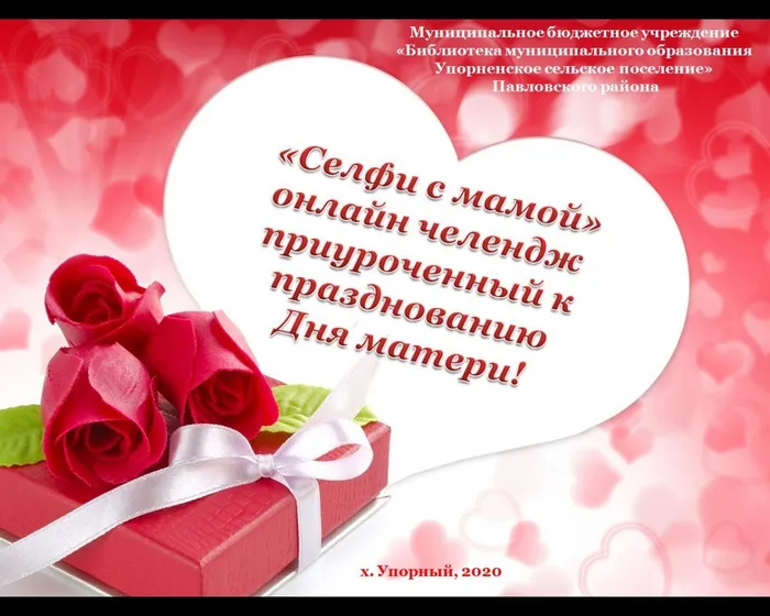 Читатели МБУ "Библиотека МО Упорненское СП" присоединяются к онлайн челенджу "Селфи с мамой", целью которого является утверждение значимости роли матери и семьи в обществе, а также духовно-нравственное воспитание. Посмотреть видеоролик с работами участников вы сможете, перейдя по ссылке